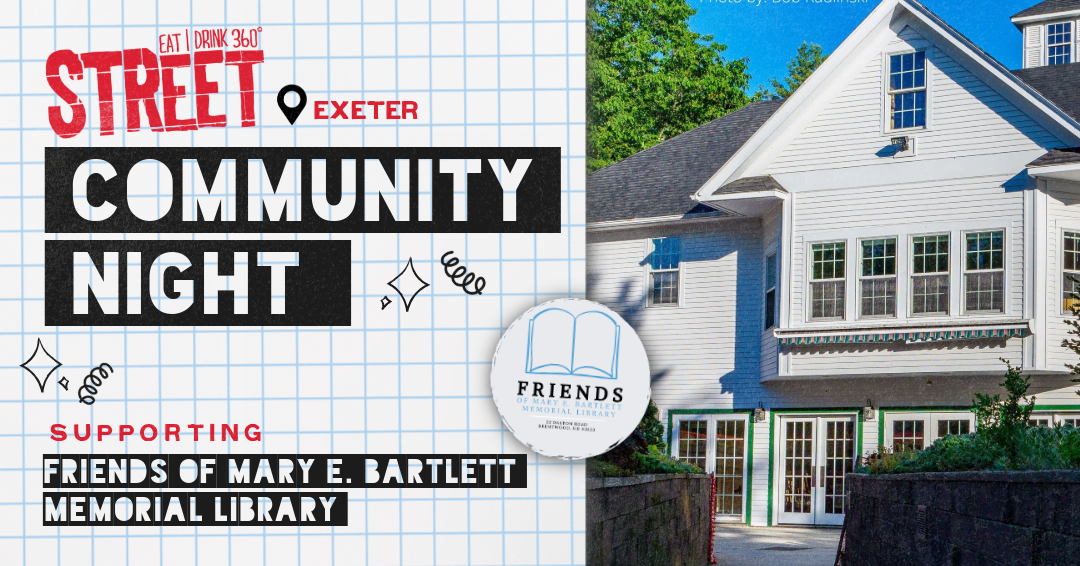 Join us at Street Exeter on Tuesday, December 30, 2026 for Community Night benefiting the Friends of the Mary E. Bartlett Memorial Library. Mention this event to your server, and we’ll donate 20% of your in-house sales to support their ongoing efforts.